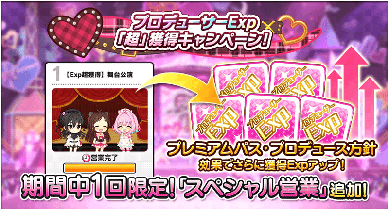 期間中、大量のプロデューサーExp (経験値) が獲得できる「スペシャル営業」が行えます。