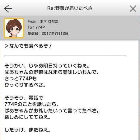 | ○○Pがいてくれっから、あたし、仕事以外でも助かってるよお。何かお礼を……そうだ。田舎から野菜が届いてるから、なんか作って持ってくねぇ。 | 指定なし | 横から乱入 |