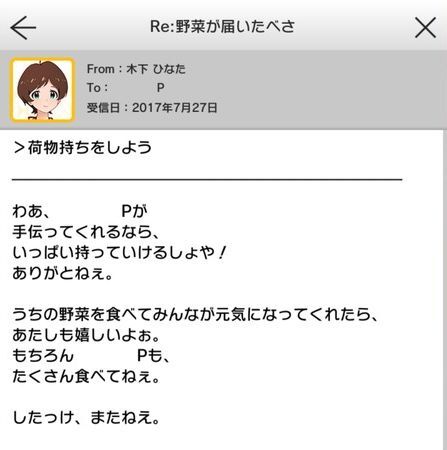 | ○○Pがいてくれたから、あたし、がんばれたよぉ。ありがとうねぇ。アイドルのお仕事はゆるくないけど、素敵なことがいっぱいで、苦労なんか忘れるぐらい楽しいべさ!○○P。これからもあたしに、アイドル、教えてねぇ。 | 覚醒ゲージMAX達成 |