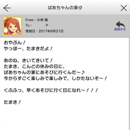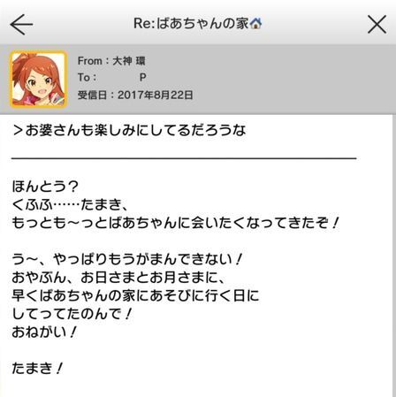 | おやぶんおやぶーん!たまき、家族と遊びに行くんだ!それでね、お願いがあって……。おやぶんも一緒に来てほしいんだ。お父さんたちも、呼んでいいって!たまきと、い~っぱい遊ぼうね♪ | SSR【ぽかぽかおもてなし 大神環】の所持 ドレスアップルームにて |