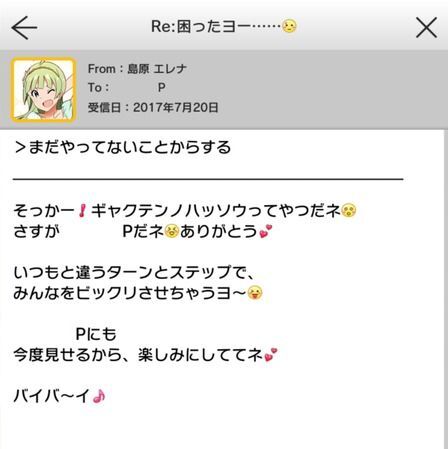 | ○○P、顔が疲れてるヨ! 忙しいカラって無理したんでショ~?たまには休まないとネ!だから……お仕事は休憩にしてワタシと一緒に遊ぼうヨー♪ | SR【コンセプト★コスチュームシリーズ 島原エレナ】の所持 |