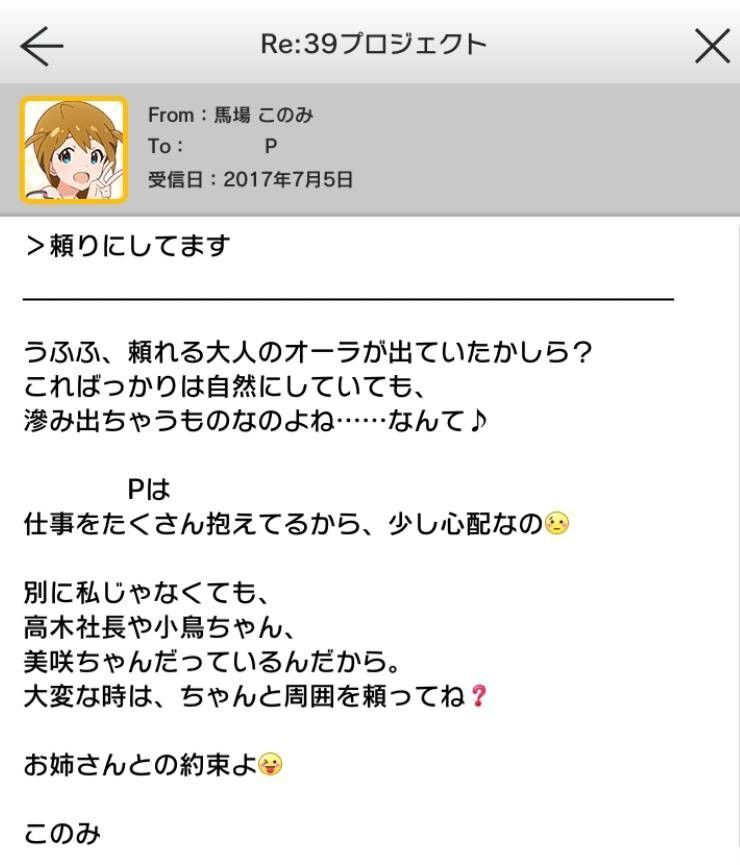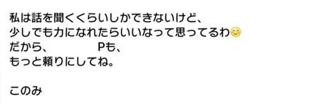 | ○○P、いつもお仕事、お疲れさま。何かあったらいつでも私に相談して!このみお姉さんとの約束よ♪ | 指定なし | 横から乱入 |