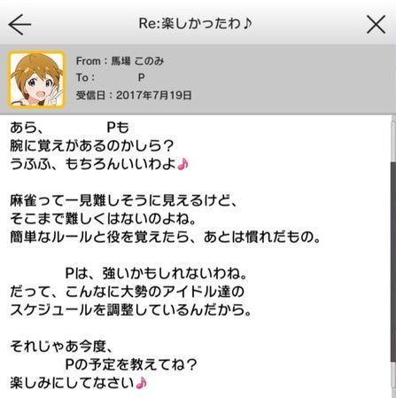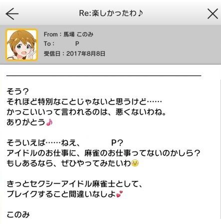 | ○○P、麻雀は打てる? 私、こう見えてけっこう得意なの…ウフフ♪でもお店に入ろうとすると、入店拒否されちゃうのよね…。そんなに無双してるつもりないんだけど。 | SSR【セクシー雀士…何を斬る? 馬場このみ】の所持 ドレスアップルーム |