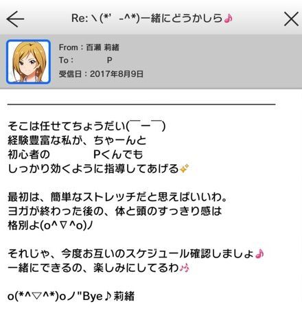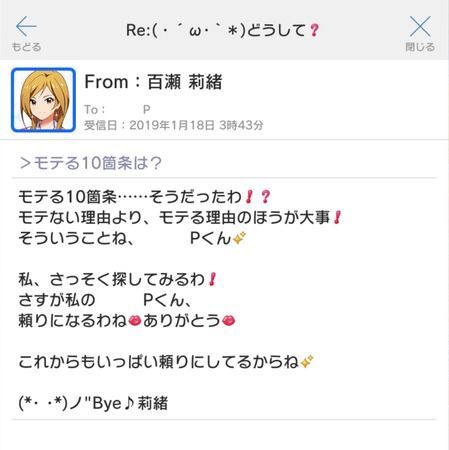 | ○○Pくん、雑誌に睡眠不足に効くツボが載ってたの。さ、手をだして……。ウフフ♪ドキドキした?これが自然にスキンシップをとれる、大人のテクニックよ! | SR【MILLION LIVE CONFERENCE! 百瀬莉緒】の所持 |