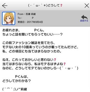 | ○○Pくん、ちょっとじっとしててくれる?そう、動かないで……!うん、素材は悪くないんだもの。メイクしたらきっと!ねえ、今度お姉さんに任せてみない? | SR【MILLIONSTARS Team2nd 百瀬莉緒】の所持 |