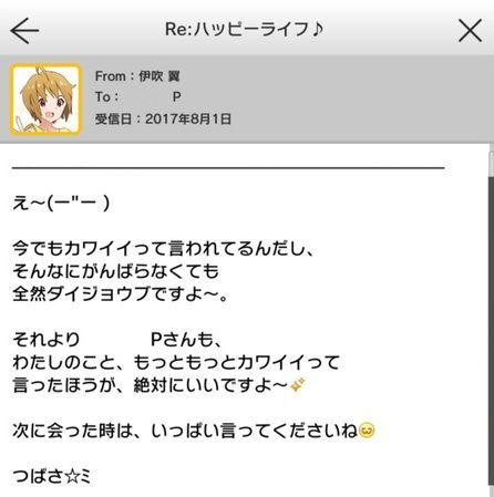 | ○○Pさん!わたしに、カワイイって言ってくれませんか? 今すぐっ!!……やっぱりそうですよねー♪えへへ。褒めてもらえたし、今日もバッチリ頑張りまーす♪ | SSR【ロケットスター☆ 伊吹翼】の所持 ドレスアップルーム |