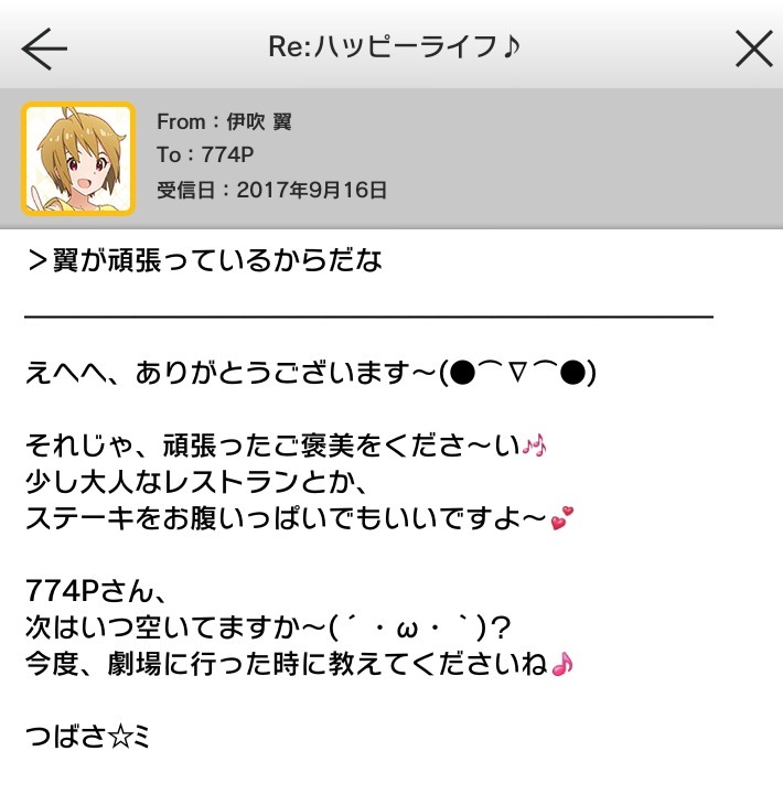 | お休みの日に遊ぶのも楽しいですけど、学校帰りに遊びに行くと、もっと楽しく感じるんですよね~♪というわけで! このあと一緒に遊びに行きませんか? いいでしょ○○Pさん♪ | SR【コンセプト★コスチュームシリーズ 伊吹翼】の所持 |