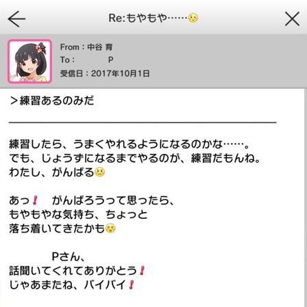 | ○○Pさん、聞いて聞いて! わたし、すっごくいいことを思いついたの!わたし、いつか流れ星を見ながらライブしてみたいな。ぜったいステキだと思うよ! | SR【おやすみ♪ 中谷育】の所持 |