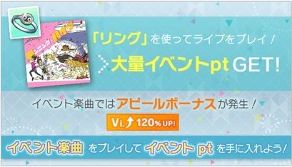 ![]() | イベント楽曲は、通常・特別楽曲よりも多くイベントptを獲得できます イベント楽曲ではアピールボーナスがスコアに反映されます |