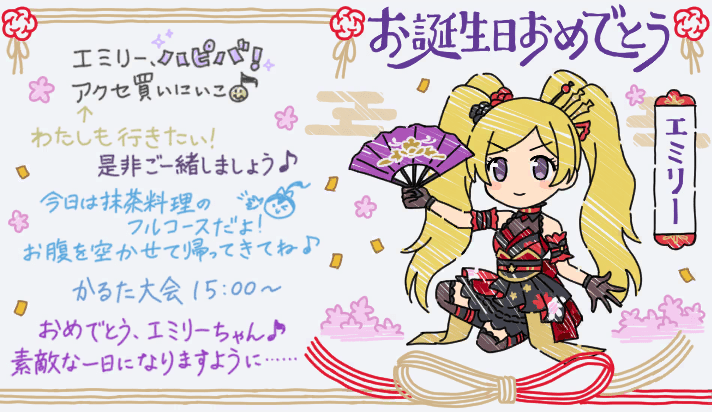 | 8月22日? | ![]() | 【エントランス入場時セリフ】 今日はアタシの誕生日をお祝いしてくれるんだってね。 詩花が何か言ったのかな……。もちろん、嬉しいけど! | 劇場の年間パスポート? やった、前からこっそり 客席に紛れ込みたかったんだよ! ありがとう! (※Birthday Live無し) | (無し) |