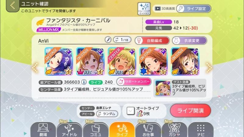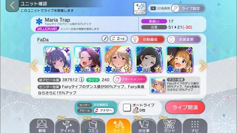 ・センター効果とFairy曲のアピールボーナスを最大に得る為、Fairyタイプのアイドルのみで構成