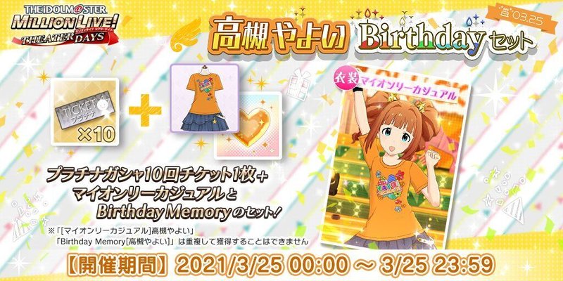 本日2021/03/25は高槻やよいの誕生日です!誕生日を記念し「高槻やよいBirthdayセット」が登場!