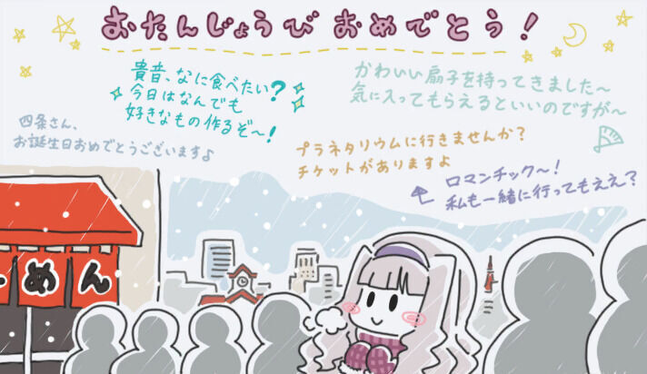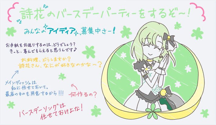 | 2月20日 | ![]() | ○○Pさん、今日はわたしの お誕生日なんですよ♪ 素敵な1日にしましょうね! | 【トキメキの音符になって】 たくさんお祝いしてもらって、うれしかったです! | 箱崎星梨花Birthdayガシャ2021 箱崎星梨花Birthdayセット2021 |