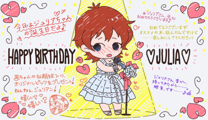 | 9月26日 | ![]() | ○○P。今日はあたしのバースデー、 準備はバッチリだろうな? もちろん、ライブのだよ♪ | 【流星群】 バースデーライブ、最高に楽しかったよ♪ | ジュリアBirthdayガシャ2020 ジュリアBirthdayセット2020 |