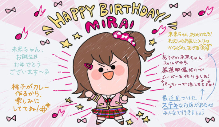 | 6月29日 | ![]() | おはようございます! 今日は私の誕生日です♪ みんなが楽しく過ごせる日になるといいな~。えへへ♪ | (無し) | (無し) |