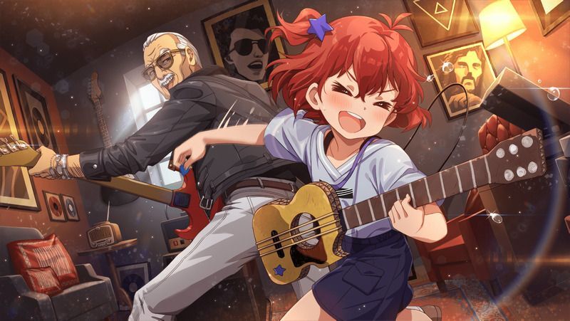 | へー。前よりうまくなってるじゃん。こら、やめるな、あんたのギター聞かせろって!そのコードは……こう。……OK、上出来だ♪ | カードセリフ |