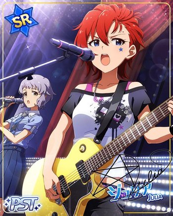 | ギターさえあれば、世界のすべてはあたしの足元にひざまずく……なんてな!さあ、音楽の魔法で、みんなまとめてあたしの作った最高の世界へ連れていくよ。……覚悟しな! | カードセリフ |