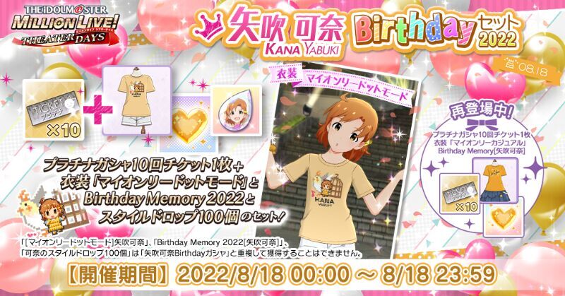 ※「[マイオンリードットモード]矢吹可奈」、「Birthday Memory 2022[矢吹可奈]」、「可奈のスタイルドロップ100個」は「矢吹可奈Birthdayガシャ」と重複して獲得することはできません。