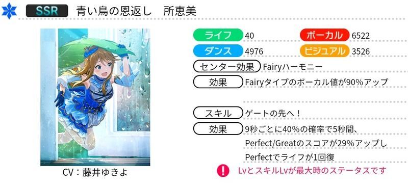 | 9秒ごとに31%の確率で5秒間、Perfect/Greatのスコアが29%アップしPerfectでライフが1回復 |