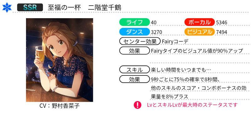 | 9秒ごとに66%の確率で8秒間、他のスキルのスコア・コンボボーナスの効果量を8%プラス |