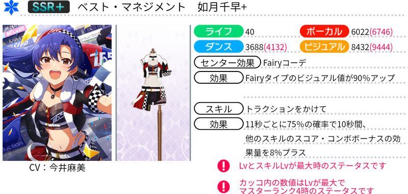 | 11秒ごとに66%の確率で10秒間、他のスキルのスコア・コンボボーナスの効果量を8%プラス |