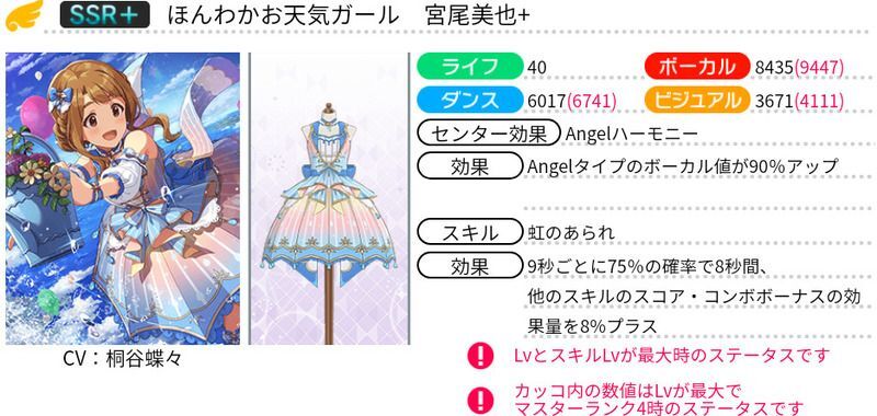 | 9秒ごとに66%の確率で8秒間、他のスキルのスコア・コンボボーナスの効果量を8%プラス |