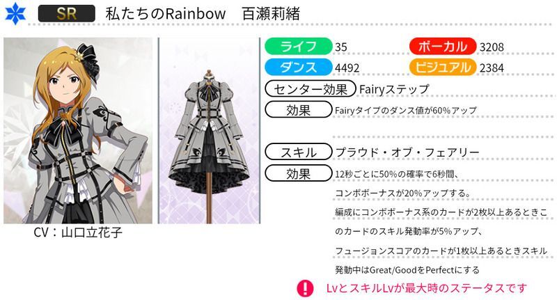 | 12秒ごとに41%の確率で6秒間、コンボボーナスが20%アップする。編成にコンボボーナス系のカードが2枚以上あるときこのカードのスキル発動率が5%アップ、フュージョンスコアのカードが1枚以上あるときスキル発動中はGreat/GoodをPerfectにする |