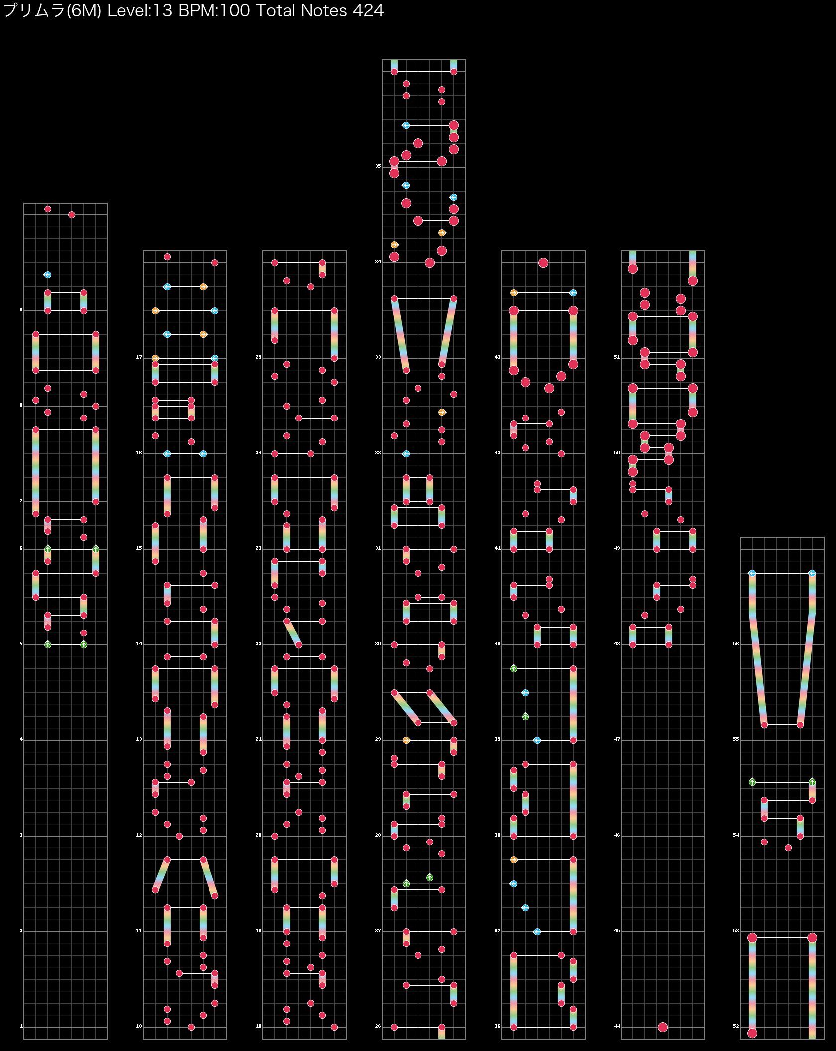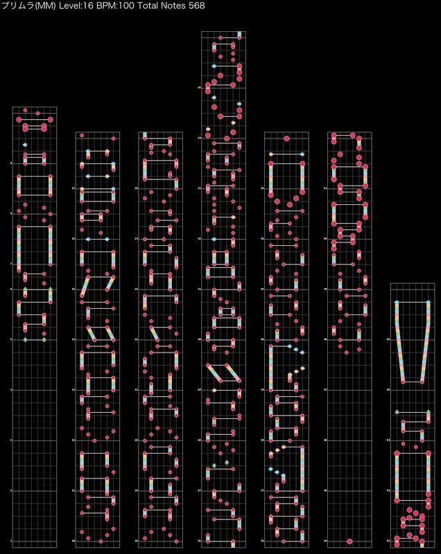 - 音符はほとんどが歌合わせでリズムが掴みやすい。16分音符が主体だがBPM100と遅く、殆どが左右交互で押せるようになっている。
