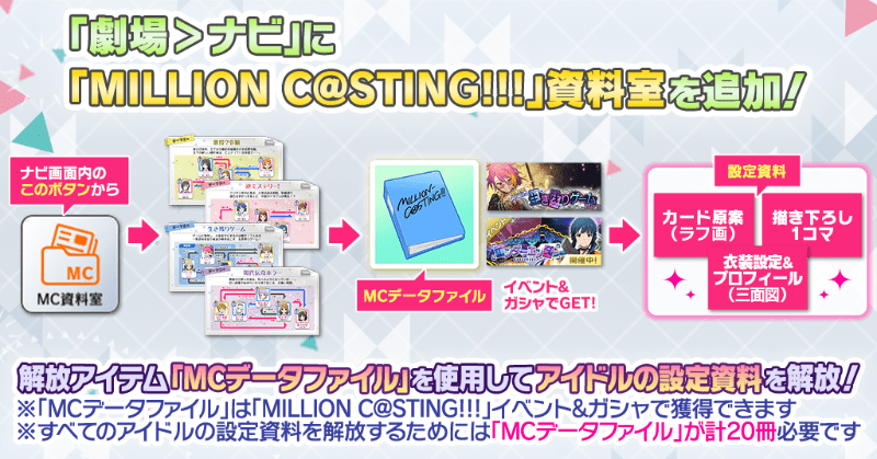 2023/11/17(金)15:00より「劇場>ナビ」に「MILLION C@STING!!!」資料室(MC資料室)を追加いたしました。