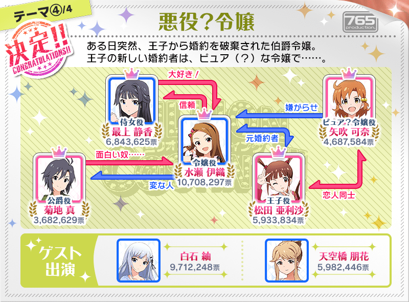 ※配役ごとの投票で2位になったアイドルのうち、各ドラマテーマ内での得票数が上位2名のアイドルは、楽曲CDに収録されるボイスドラマにゲストとして出演予定です。