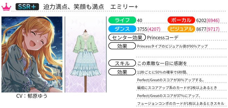 | 11秒ごとに41%の確率で6秒間、Perfect/Greatのスコアが30%アップする。編成にスコアアップ系のカードが2枚以上あるときPerfect/Greatのスコアが37%にアップ、フュージョンコンボのカードが1枚以上あるときスキル発動中はGreat/GoodをPerfectにする |
