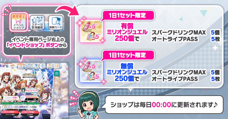 イベント専用ページの「イベントショップ」ボタンから、「スパークドリンクMAX」5個と「オートライブPASS」5枚セットを1日1回限定でご利用いただけます。