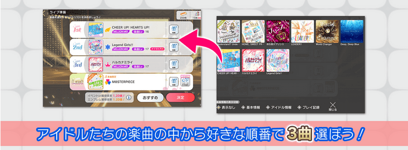 ライブ準備画面でセットリスト設定時、選択したい楽曲のジャケットをタッチすると、アイドル別やクリア条件別でフィルタリングできるようになりました。
