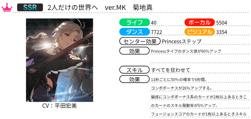 | 11秒ごとに41%の確率で6秒間、コンボボーナスが26%アップする。編成にコンボボーナス系のカードが2枚以上あるときこのカードのスキル発動率が5%アップ、フュージョンスコアのカードが1枚以上あるときスキル発動中はGreat/GoodをPerfectにする |