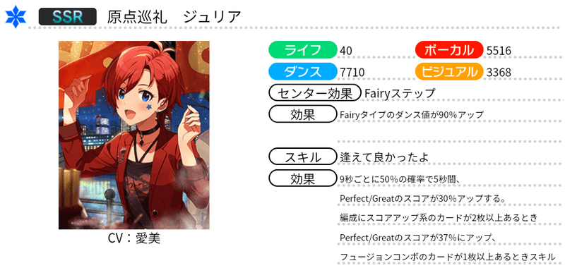 | 9秒ごとに41%の確率で5秒間、Perfect/Greatのスコアが30%アップする。編成にスコアアップ系のカードが2枚以上あるときPerfect/Greatのスコアが37%にアップ、フュージョンコンボのカードが1枚以上あるときスキル発動中はGreat/GoodをPerfectにする |