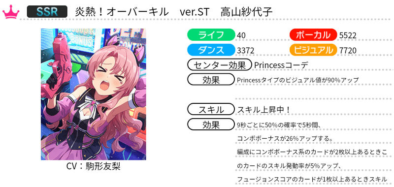 | 9秒ごとに41%の確率で5秒間、コンボボーナスが26%アップする。編成にコンボボーナス系のカードが2枚以上あるときこのカードのスキル発動率が5%アップ、フュージョンスコアのカードが1枚以上あるときスキル発動中はGreat/GoodをPerfectにする |
