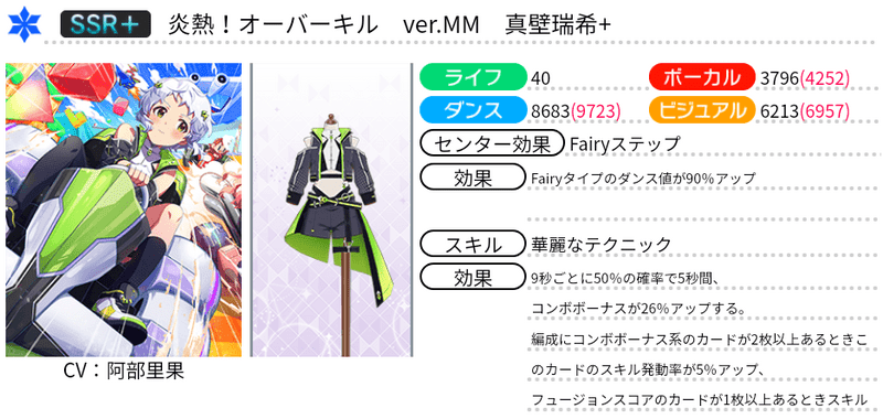 | 9秒ごとに41%の確率で5秒間、コンボボーナスが26%アップする。編成にコンボボーナス系のカードが2枚以上あるときこのカードのスキル発動率が5%アップ、フュージョンスコアのカードが1枚以上あるときスキル発動中はGreat/GoodをPerfectにする |