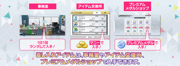 | アイドル | 興味を持つ差し入れアイテム 事務所・アイテム交換所 | 興味を持つ差し入れアイテム プレミアムメダルショップ |