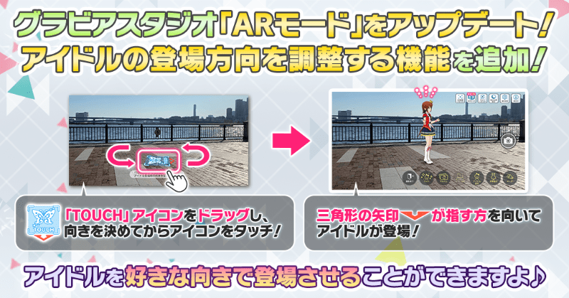 ARモードにて、地面を検知した後に表示される「TOUCH」アイコンをドラッグして回転させてからタッチすると、三角形の矢印が指す方を向いてアイドルが登場するようになりました。