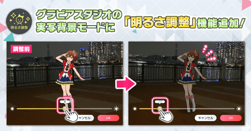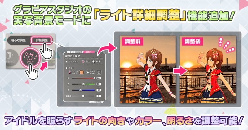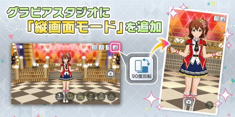 - 2021/01/23に実施されたリアルステージイベント『ミリシタ感謝祭2020~2021 ONLINE』の開催後、ゲーム内へグラビアスタジオ機能が実装されました。