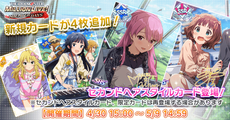 新規追加のセカンドヘアスタイルカードは、アイドルを新しい髪型「セカンドヘアスタイル」で登場させられるようになるカードとなり、専用衣装はライブだけでなく事前に設定することで、劇場やコミュにもアイドルの私服として登場する衣装となりますので、ぜひご確認ください。