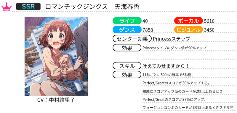 | 11秒ごとに41%の確率で6秒間、Perfect/Greatのスコアが30%アップする。編成にスコアアップ系のカードが2枚以上あるときPerfect/Greatのスコアが37%にアップ、フュージョンコンボのカードが1枚以上あるときスキル発動中はGreat/GoodをPerfectにする |