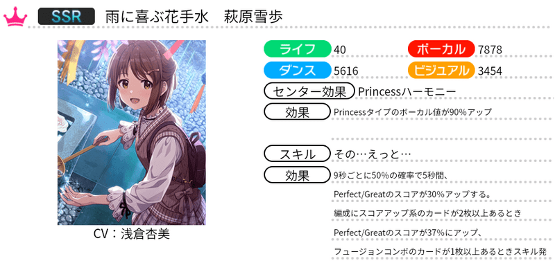 | 9秒ごとに41%の確率で5秒間、Perfect/Greatのスコアが30%アップする。編成にスコアアップ系のカードが2枚以上あるときPerfect/Greatのスコアが37%にアップ、フュージョンコンボのカードが1枚以上あるときスキル発動中はGreat/GoodをPerfectにする |