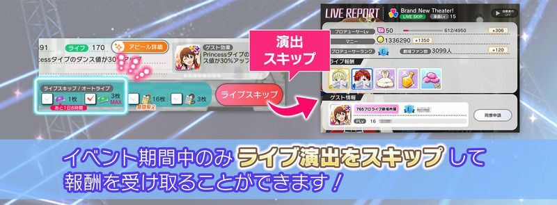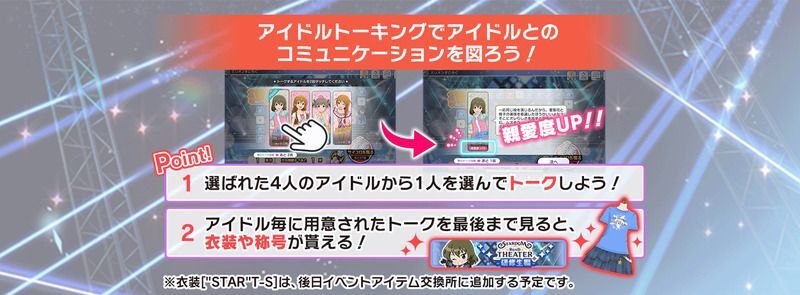 また、公演折り返しから通常楽曲またはお仕事をプレイする際に元気を最大2倍消費することができ、消費量に応じてより多くの「スター・ペンダント[Ⅲ]」やライブチケットを獲得することができます。