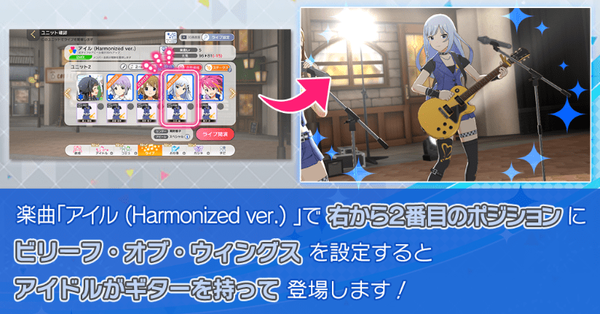 - また、本番のユニット編成画面で対応衣装を設定しておくと、リハーサル時に専用のレッスンウェアを着用したアイドルがギターを持って登場します