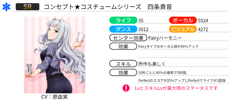 | 10秒ごとに31%の確率で5秒間、Perfectのスコアが25%アップしPerfectでライフが1回復 |
