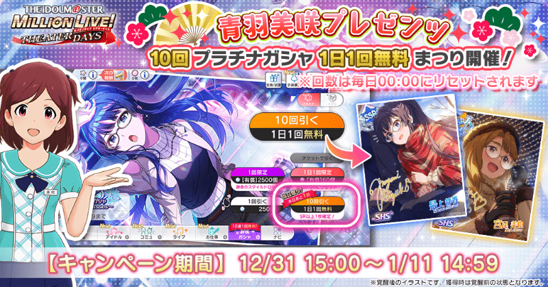 【ミリシタ】青羽美咲プレゼンツ 10回プラチナガシャ1日1回無料まつり(2024.12.31)