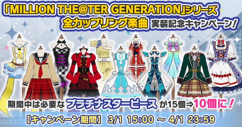 2025/03/01(土)より、「MILLION THE@TER GENERATION」シリーズの全カップリング楽曲の実装を記念して、「イベントアイテム交換所」にある以下の衣装を対象に、プラチナスターピースが15個→10個で交換できるキャンペーンを実施いたします!