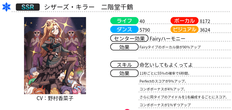 | 11秒ごとに46%の確率で6秒間、Perfectのスコアが9%アップ、コンボボーナスが4%アップ、さらに同タイプのアイドルを1名編成するごとにスコア、コンボボーナスが1%ずつアップ |