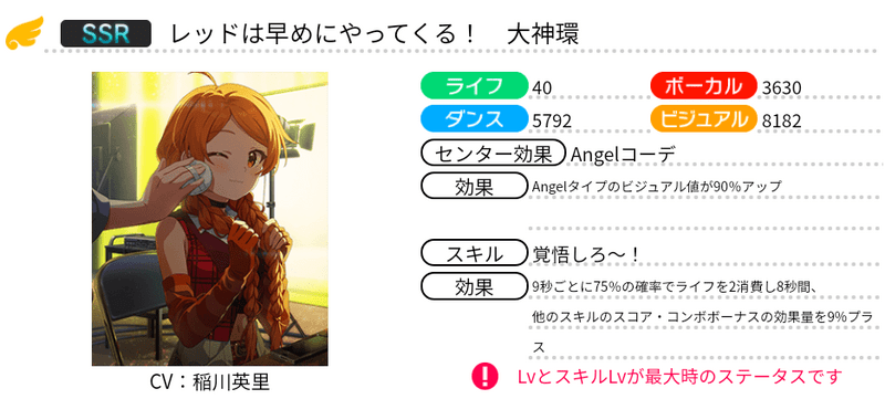 | 9秒ごとに66%の確率でライフを2消費し8秒間、他のスキルのスコア・コンボボーナスの効果量を9%プラス |